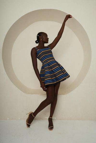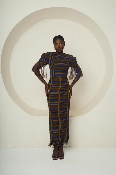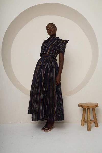 The palette centres on navy, gold, and cornflower blue Aso-Oke(hand woven fabric) chosen not only for their