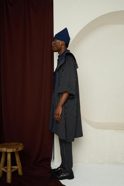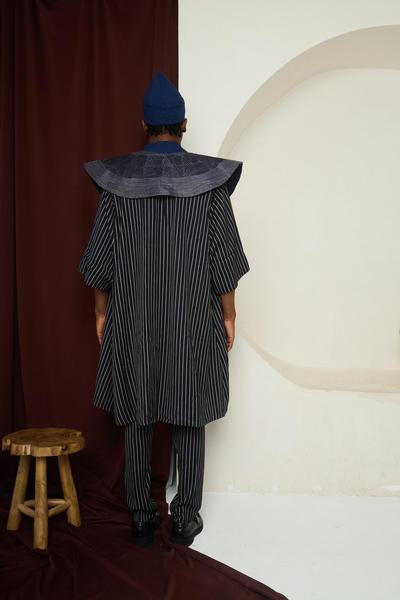 • Cut: Flowing agbada-style coat layered over tailored vest and trousers