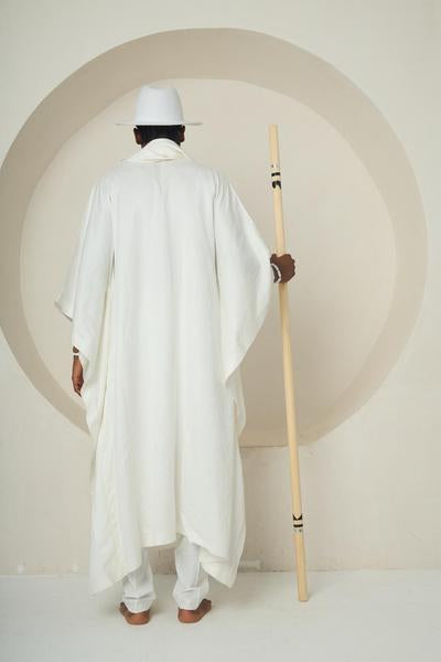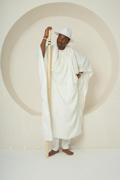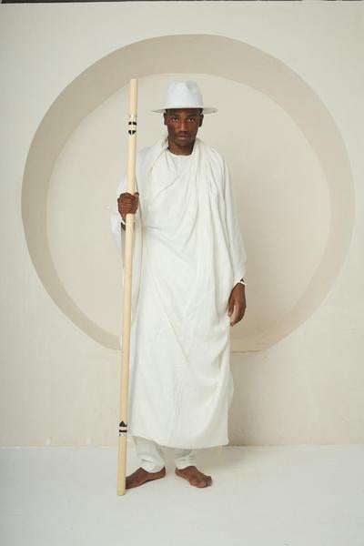 Runway + Ritual wear Crossover) An ankle-length white robe crafted in soft cotton-silk, cut with a loose, flowing silhouette that evokes the serenity and grace of Ẹyọ movement. The ensemble features subtle shoulder structure and is worn over straight white trousers for balance. A traditional Akete-inspired white hat anchors the spiritual essence of the outfit, while the ceremonial staff—embellished with bands of red, indigo, and ochre—infuses the look with ancestral symbolism and painterly spirit. The design doesn’t just speak—it walks, with grace, clarity, and sacred calm.