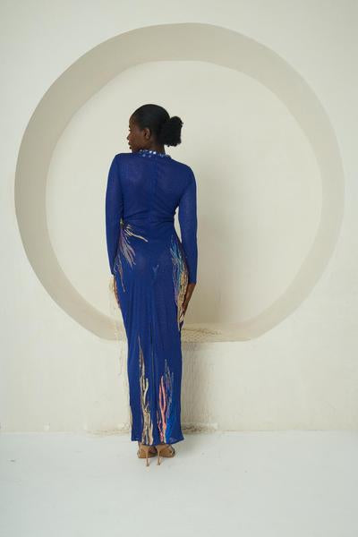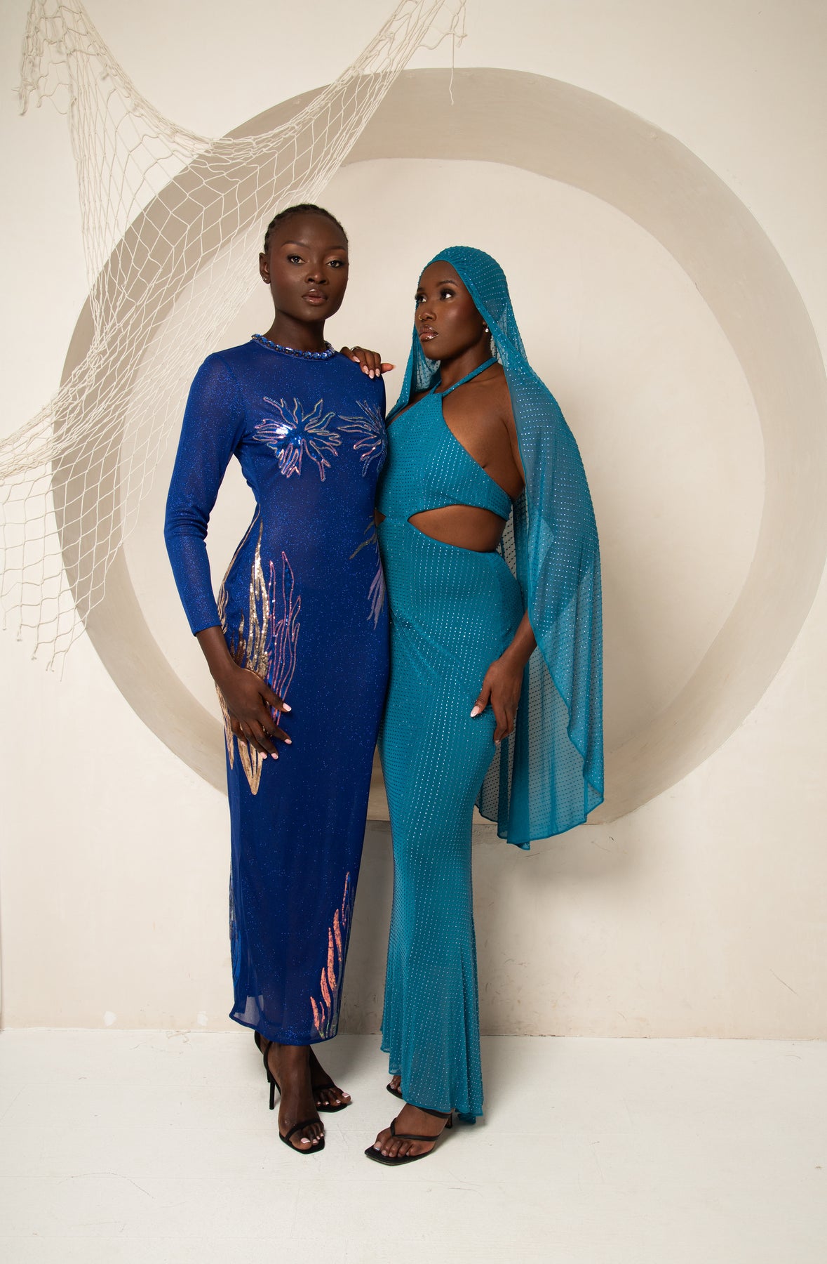 The Deepwater Gown is a study in light and depth. Cut from sheer midnight mesh, its surface is hand-embellished with cascading beads and sequins that shimmer like bioluminescent waves. The slim, floor-length silhouette elongates the body, while long sleeves balance the gown’s sheerness. Every sequin and bead is hand-applied, creating a garment that moves and glows with its own current. A statement piece that pays homage to the Ijaw people’s profound relationship with the sea.
