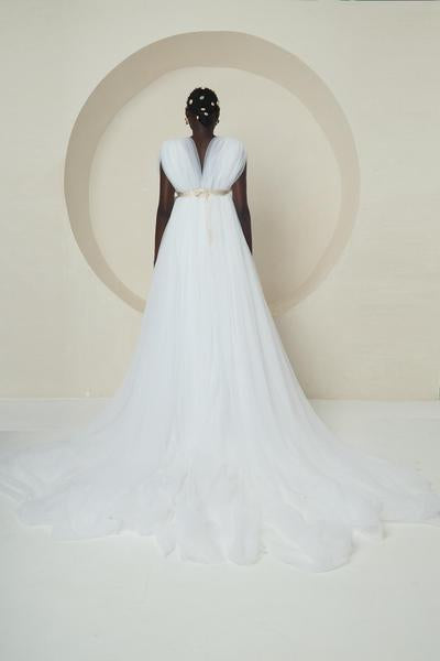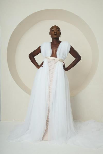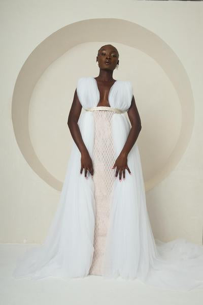 Introducing Ìmọ̀lẹ̀ Àyé, a robe that evokes a sense of light and purity. This magnificent piece features a central aso-oke panel of intricate, hand-woven detailing that runs down the length of the body, creating a stunning focal point. This is beautifully contrasted by a voluminous skirt and structured, off-the-shoulder sleeves made from layers of ethereal white tulle. The cinched waist creates a flattering silhouette before the skirt billows out into a dramatic train. Imole aye is a robe that is both grand and graceful, designed for a woman who embodies serene strength and timeless beauty.