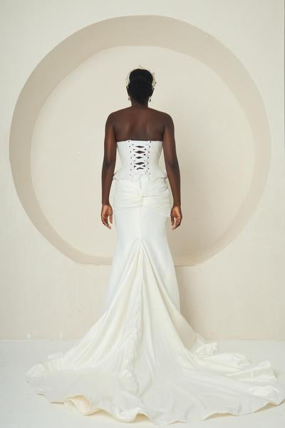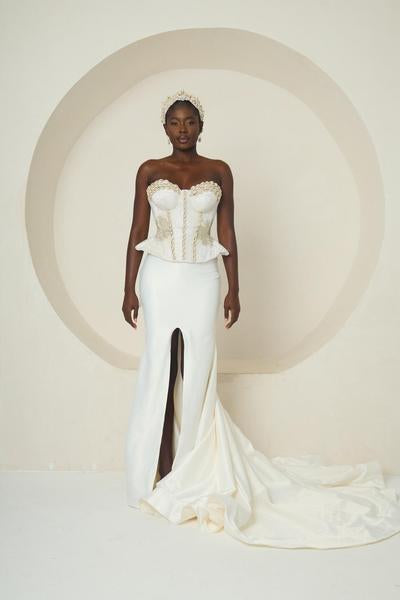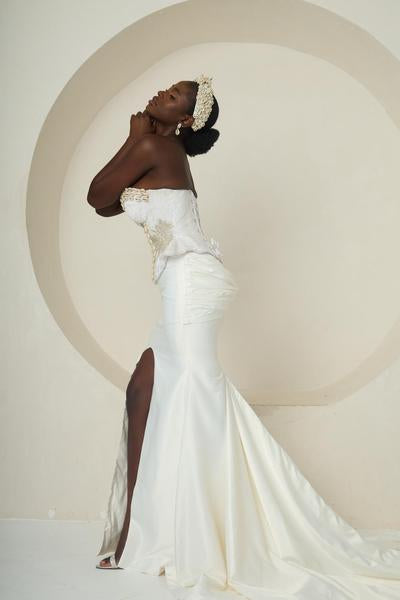 Introducing Ìyá Àgbà, an outfit that celebrates regal strength and timeless elegance. This two-piece set features a sculpted, corset-style bodice with a sophisticated peplum waist. The bodice is a masterpiece of craftsmanship, adorned with delicate silver and white embellishments. Paired with a sleek, high-slit mermaid skirt, the look is both modern and classic. The skirt flows gracefully into a subtle train, adding a touch of drama with every step. IYA AGBA is a powerful tribute to matriarchal grace, designed for a woman who embodies both beauty and authority.