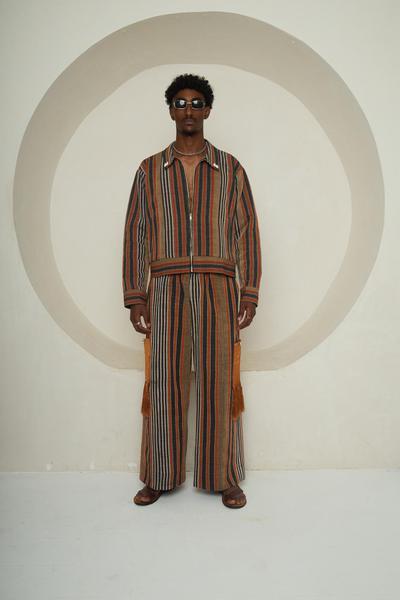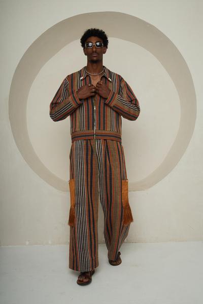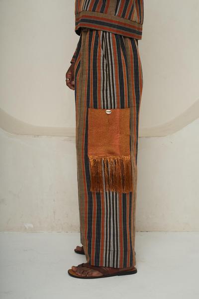 Step up your style with these multicoloured Aso-Oke cargo pants, handwoven with vibrant stripes and a richly textured finish. Designed for a relaxed yet refined fit, this piece blends traditional craftsmanship with modern sophistication. Perfect for making a bold, timeless statement in any wardrobe Inspired by the fluid masculinity found in traditional Yoruba attire, the pants reflect a reverence for history while pushing boldly into the now.
